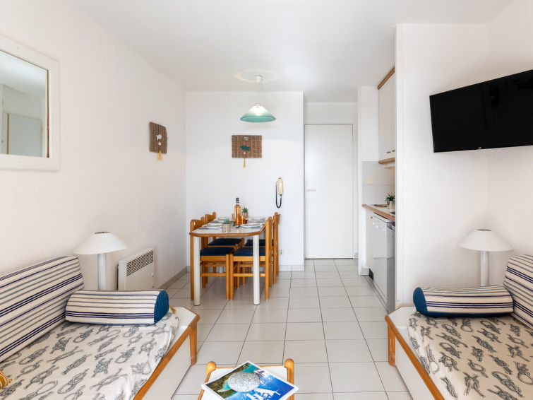 "Le Village (B1 331)", studio 1-kamer 28 m2 op de 1e verdieping. Het objekt is geschikt voor 2 volwassenen + 2 kinderen. Woonkamer met 2 divanbedden (80 cm, lengte 190 cm), TV (Flatscreen TV). Uitgang naar het terras. Cabine met 1 x 2 stapelbedden (80 cm, lengte 190 cm). Kookhoek (4-pits kookplaat, oven, afwasmachine, broodrooster, waterkoker, magnetron, elektrische koffiemachine, pads voor de koffiemachine (Dolce Gusto) extra). Bad/WC. Elektrische verwarming. Terras 8 m2. Terrasmeubelen. Ter beschikking: Internet (Internet (WiFi), extra). Parkeerplaats (1 Auto). Niet rokers woning. Maximaal 1 klein huisdier/hond toegestaan. Rookmelders. In plaats van een afgesloten slaapkamer bevinden sommige slaapgedeeltes zich in een open ruimte (galerij, nis, etc.). Aanbod door een particulier volgens art. 155, IV van CGI.
