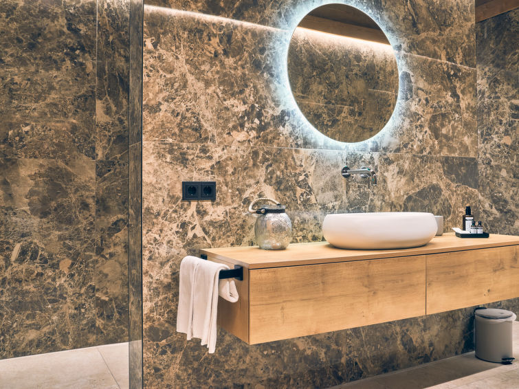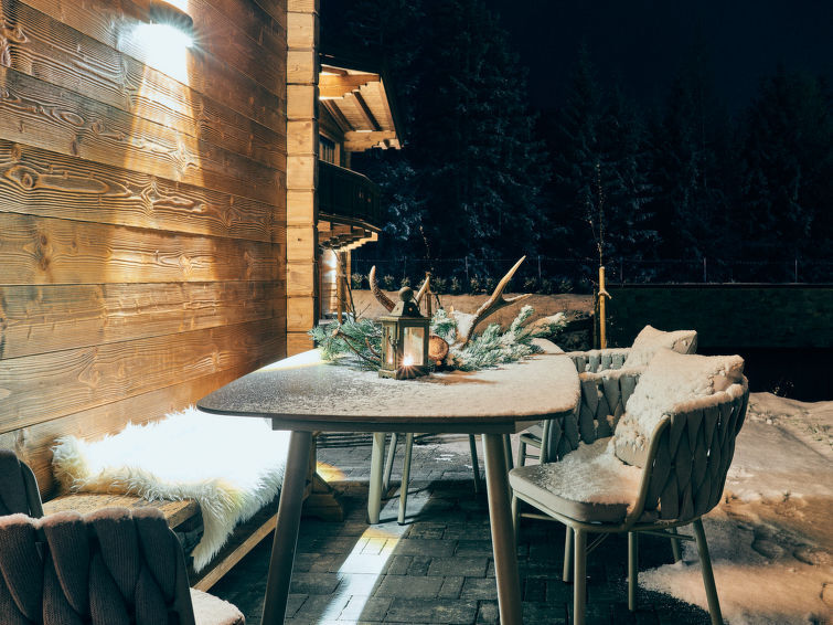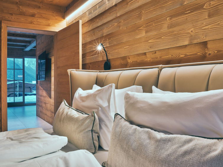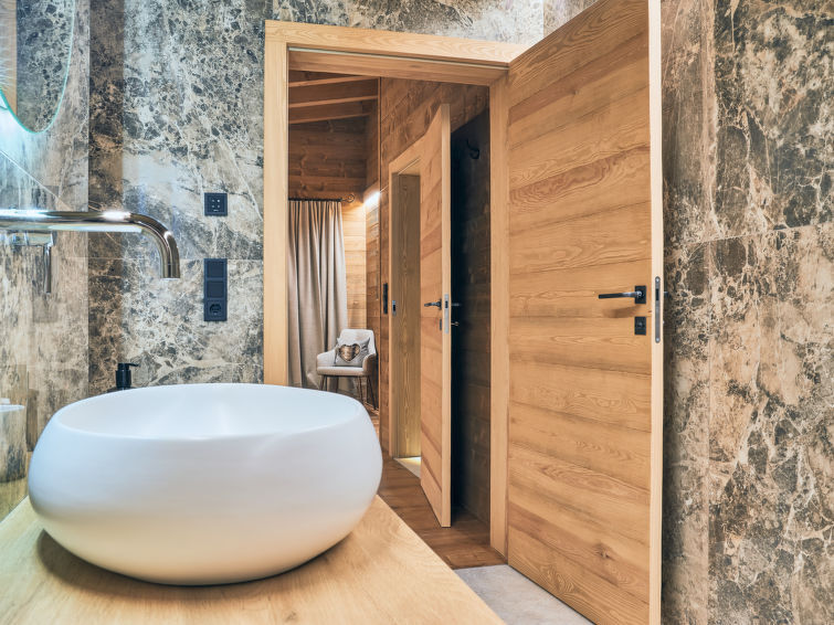"Sissis green Chalets", chalet 16-kamers. Luxueus en met veel hout ingericht: hal. 4 2-pers. kamers, elke kamer heeft douche/WC, TV en Digitale TV (Flatscreen TV). Groot woonkeuken (afwasmachine, 4 inductiekookplaten, broodrooster, waterkoker, magnetron, elektrische koffiemachine, kookeiland) met eettafel, open haard, TV en Digitale TV (Flatscreen TV), elektrische rolluiken. Uitgang naar het terras. Bovenverdieping: 8 2-pers. kamers, elke kamer heeft bad/douche/WC, TV en Digitale TV (Flatscreen TV). Uitgang naar het balkon. 4 groot terrassen 25 m2. Terrasmeubelen, barbecue, ligstoelen. Mooi uitzicht op de bergen. Ter beschikking: wasmachine, sauna, haardroger. Internet (WiFi, gratis). Parkeerplaats. Rookvrij huis.